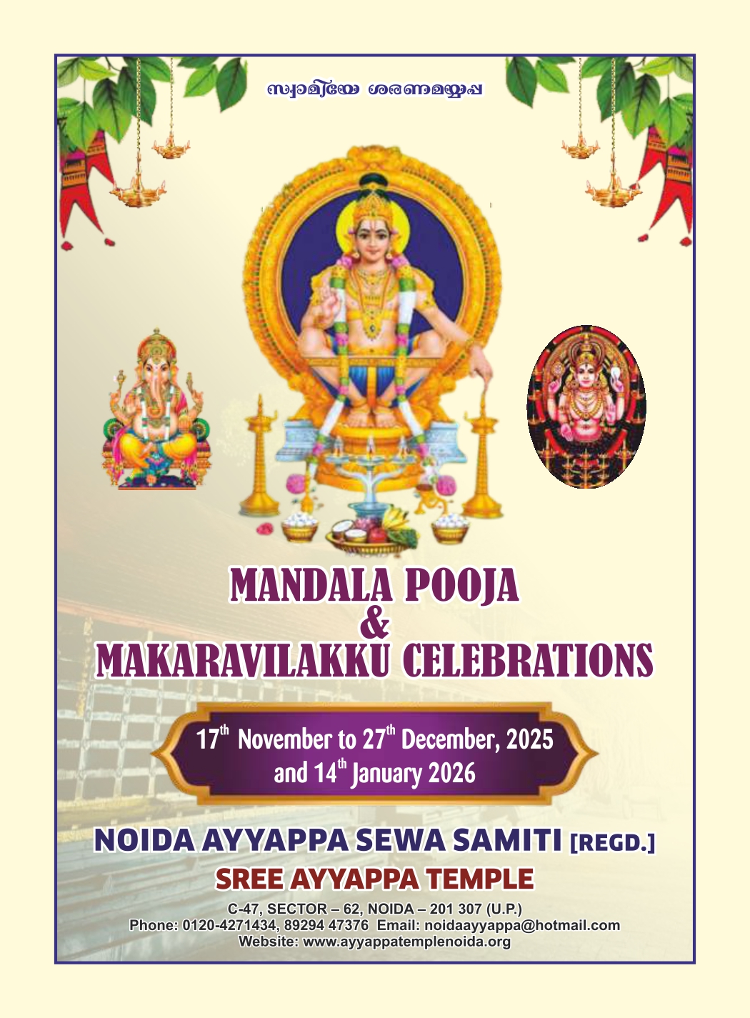 An enchanting shrine in the midst of Noida city, to usher the beneficial spirit – that was the temple of Noida Ayyappa came into existence in July 2002. Lord Sastha, the presiding deity, as the divine protector of the whole Noida, showered benediction on a cultured rave. He rode the boundaries of the Noida on His white charger; the pure, microcosmic soul. Full of devotion, the people revelled in the ineffable tenderness of Sastha. A peaceful refuge for the troubled soul that was Noida Ayyappa.